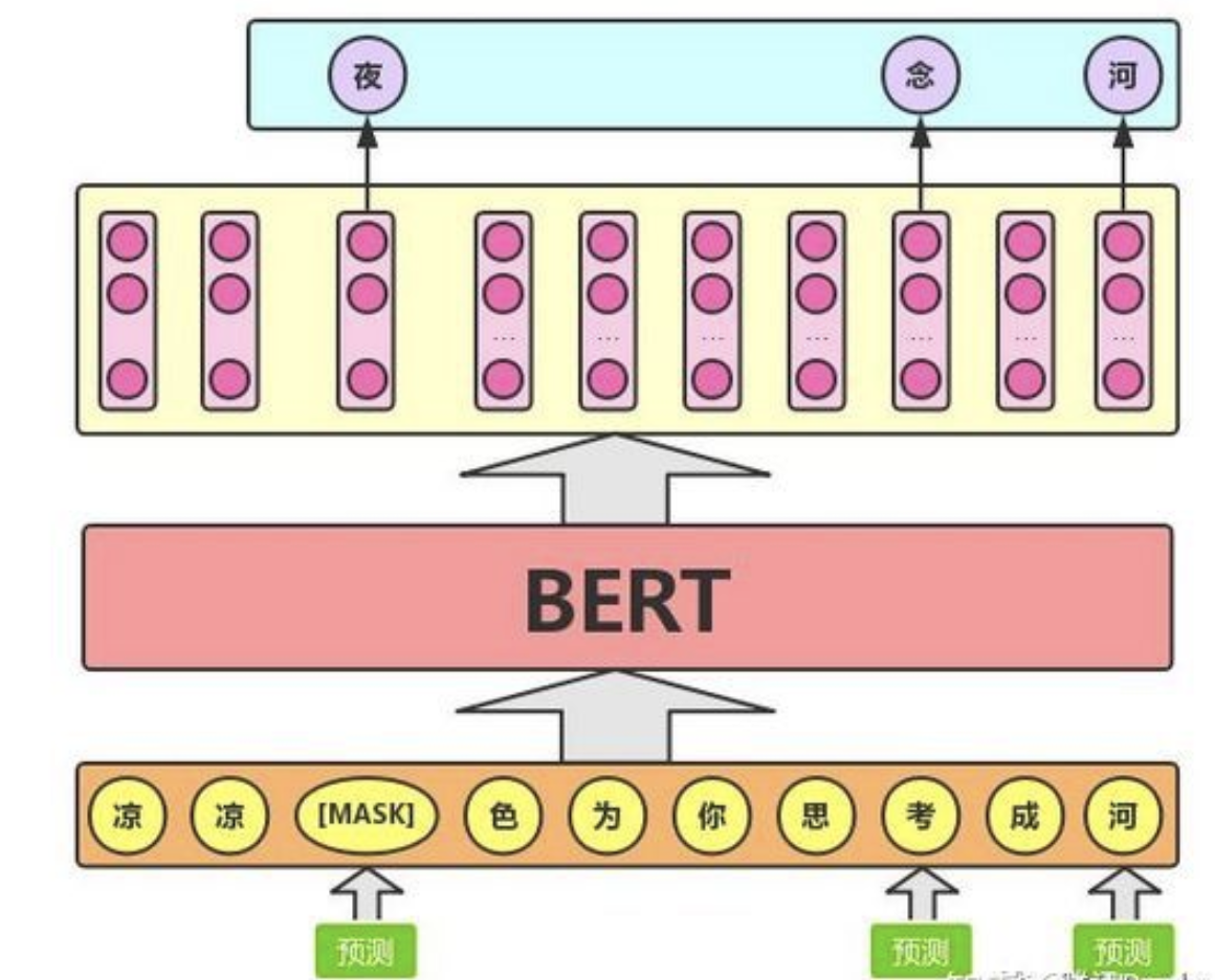 Masked LM的任务描述为:给定一句话,随机抹去这句话中的一个或几个词,要求根据剩余词汇预测被抹去的几个词分别是什么,如下图所示。
