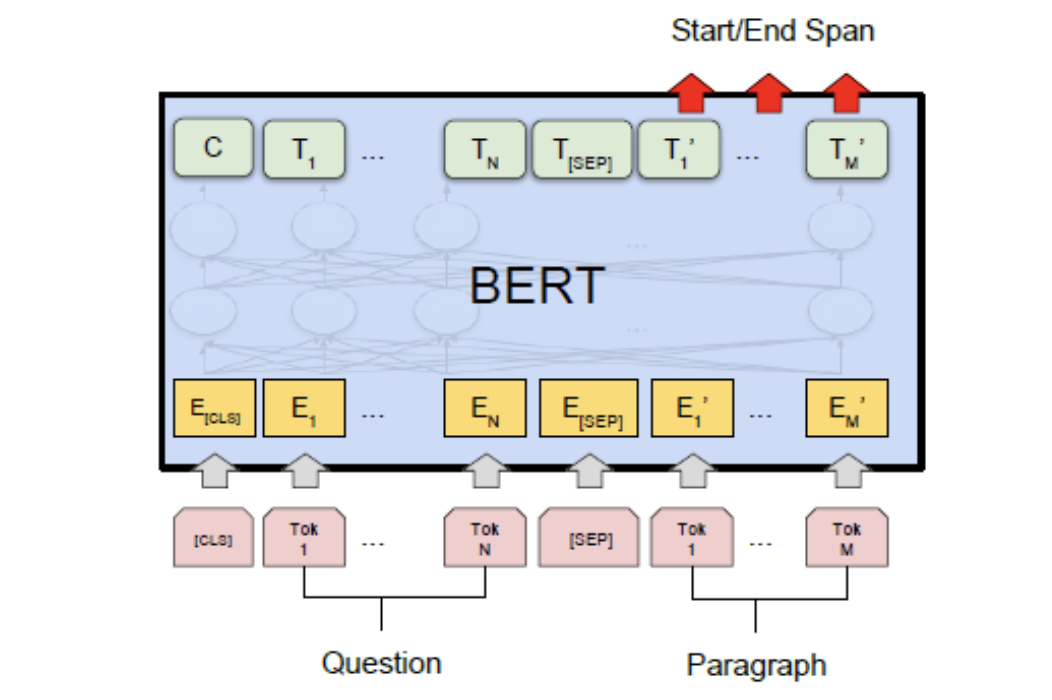 这里我们介绍如何通过设计fine-tuning来处理阅读理解与问答。如下图所示,模型的输入序列为句子对所对应的embeddings。句子对由问题和包含答案的文本组成,并有特殊分隔符”[SEP]”分隔。同其他下游任务一样,输入序列的第一个token为特殊分类嵌入”[CLS]”,同时输入序列为token embeddings,segmentation embeddings,以及position embedding之和。